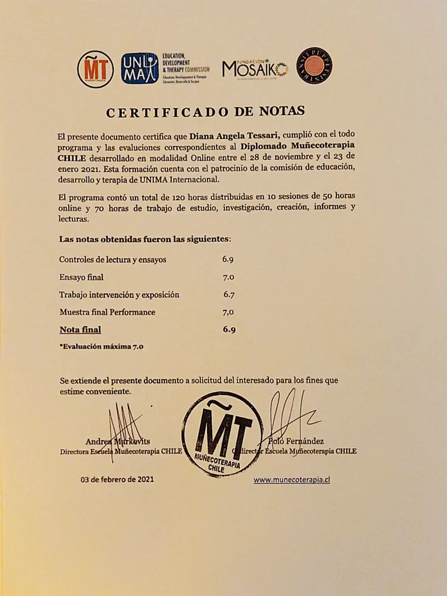 • Fundación Arché (Chile, 2019–2020): Cursos de arte, terapia y formación de formadores