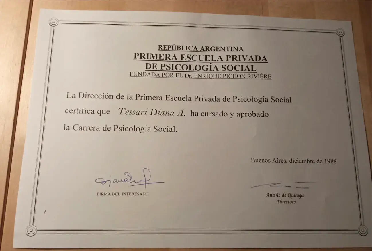 • Psicóloga Social – 1ª Escuela de Psicología Social “Dr. Enrique Pichón Rivière”, Buenos Aires, Argentina (1988)